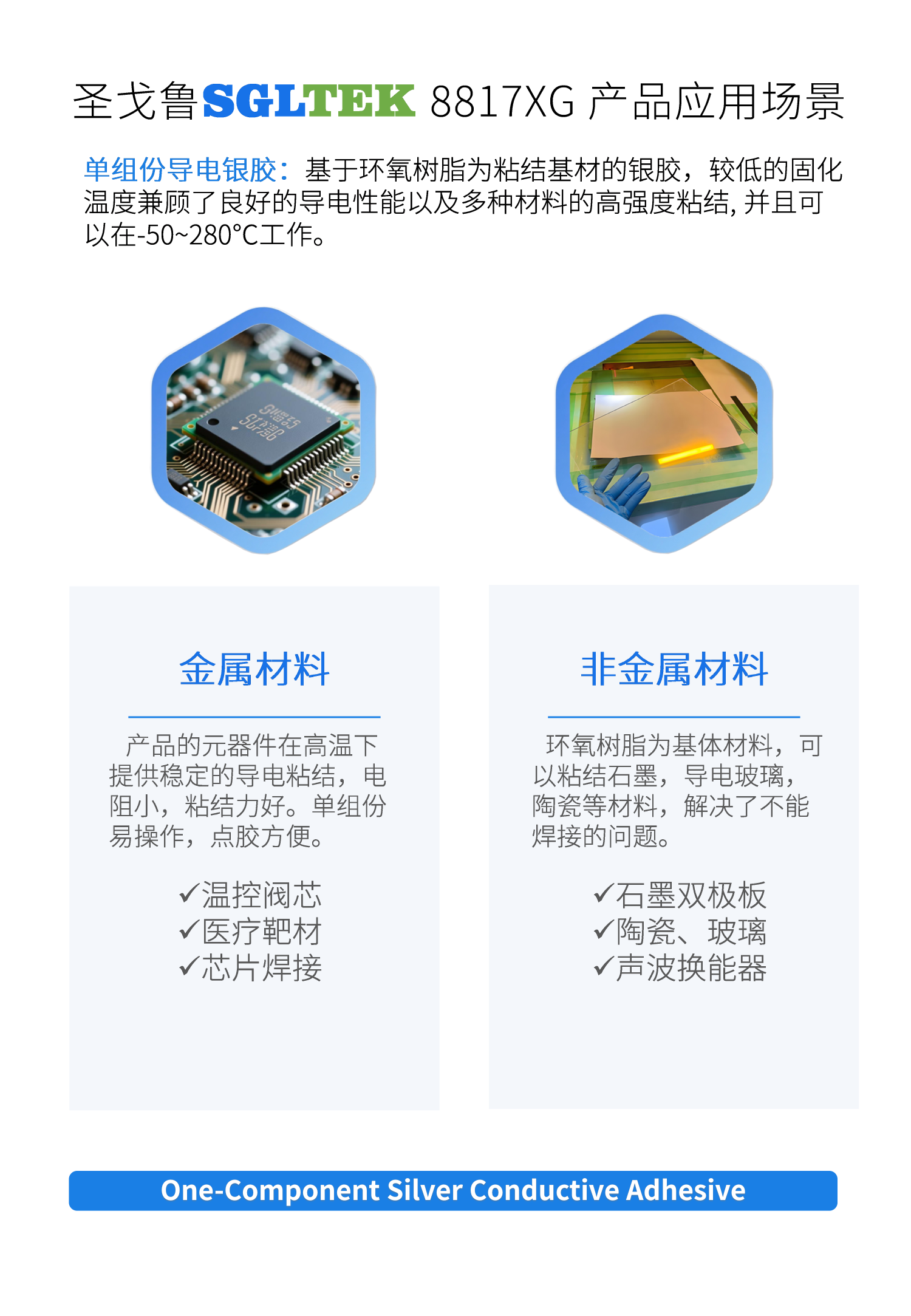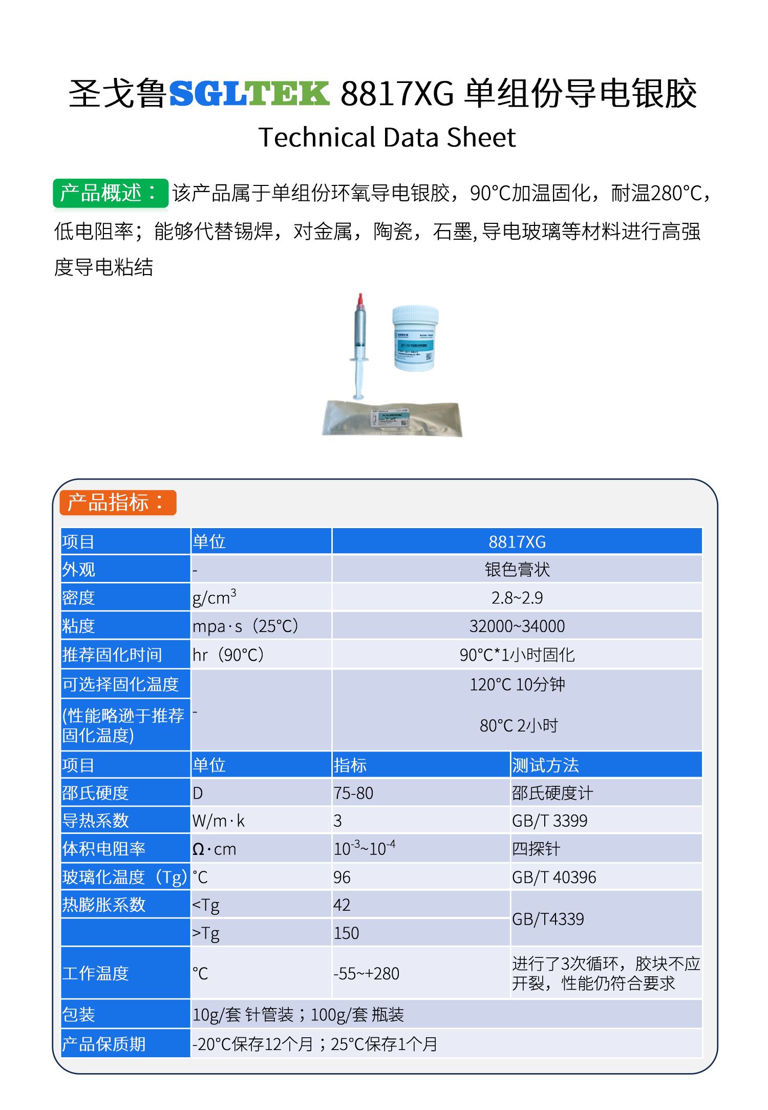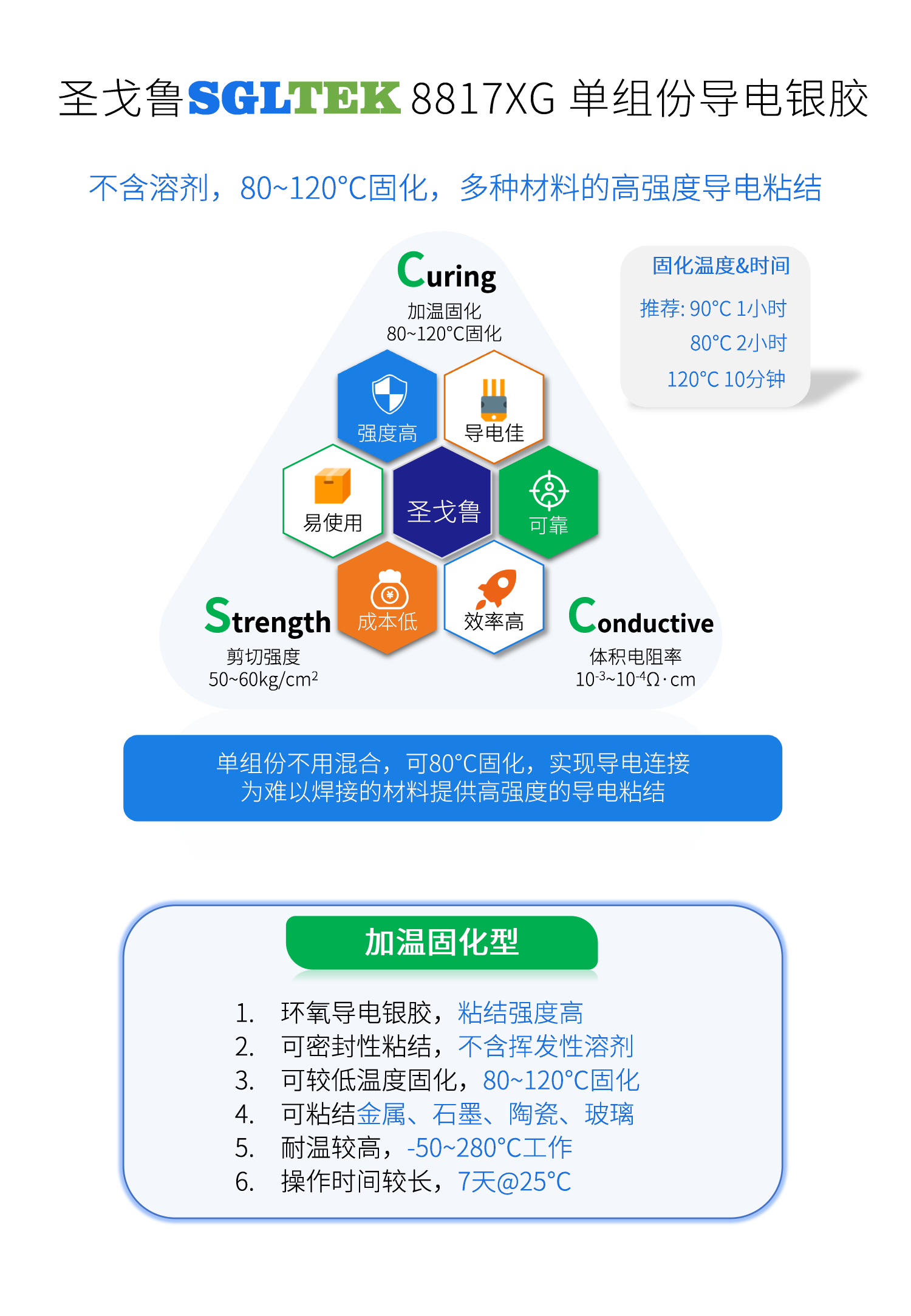 该产品属于单组份环氧导电银胶,90℃加温固化1小时,可以120℃快速固化,也可以80℃慢速固化,常温不固化;能够代替锡焊,对金属,陶瓷,石墨, 玻璃,pet等材料进行高强度导电粘结