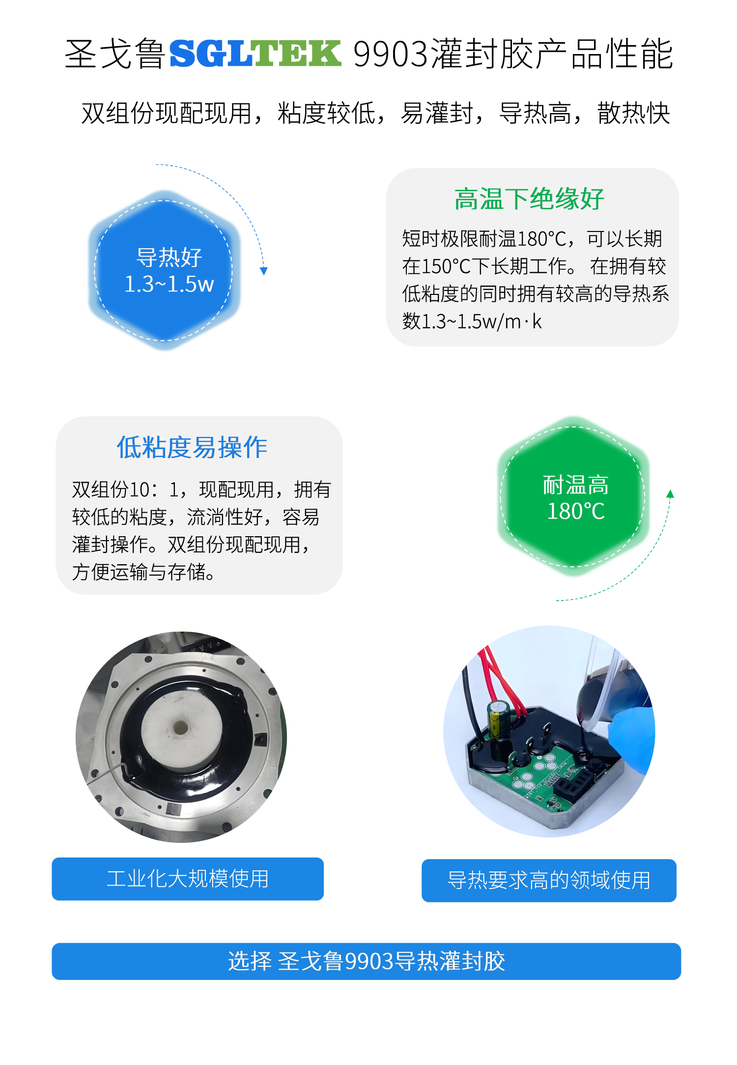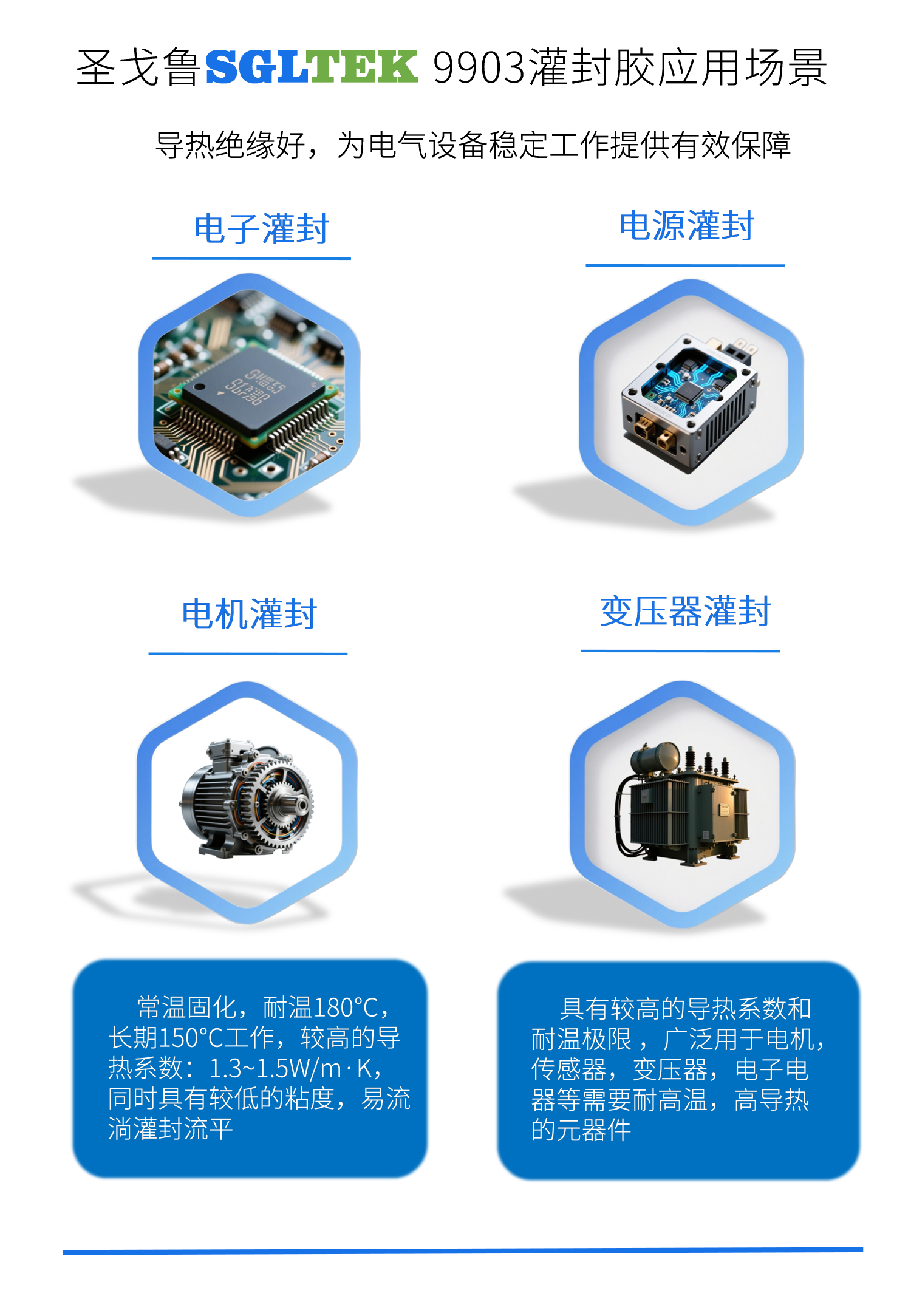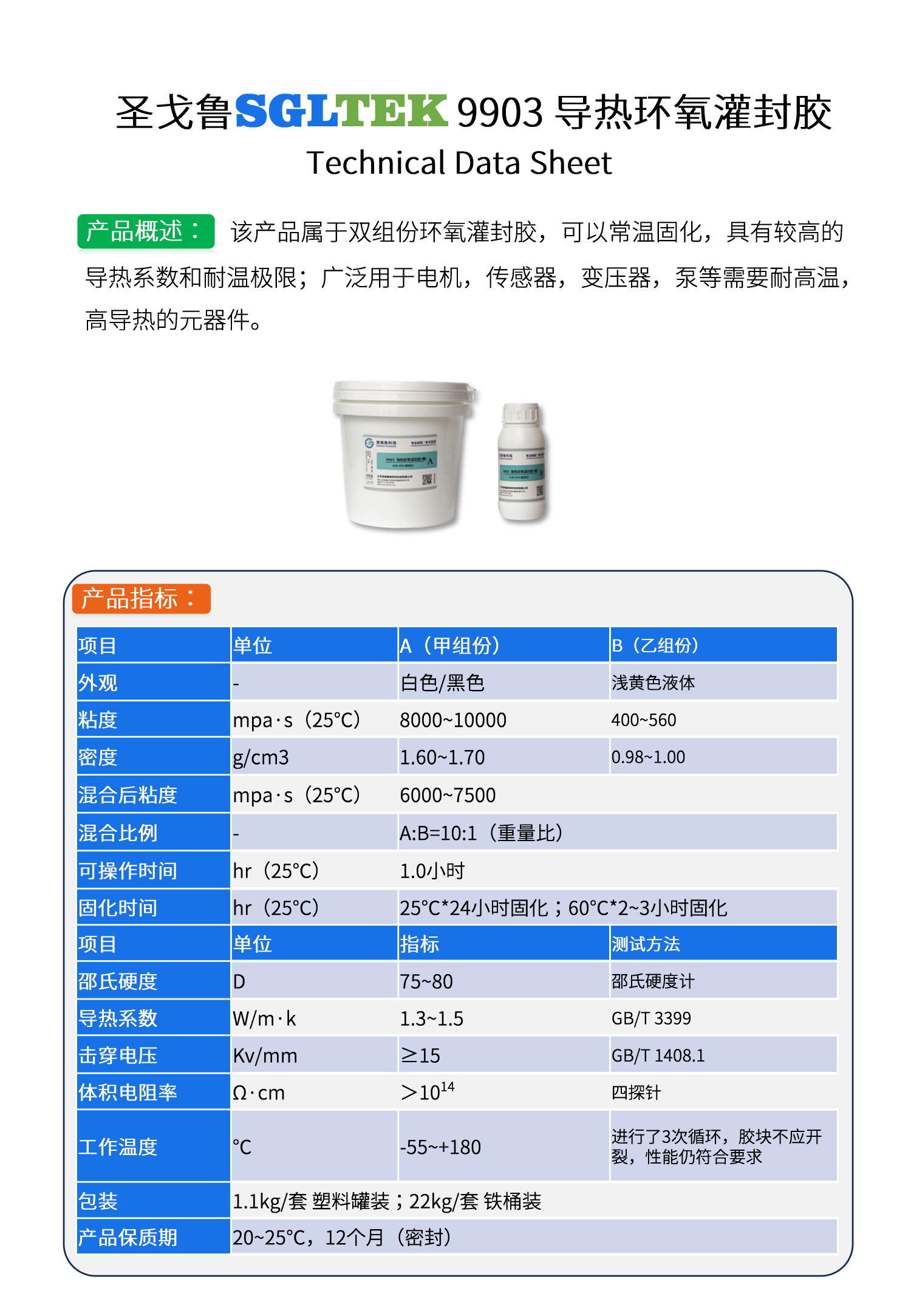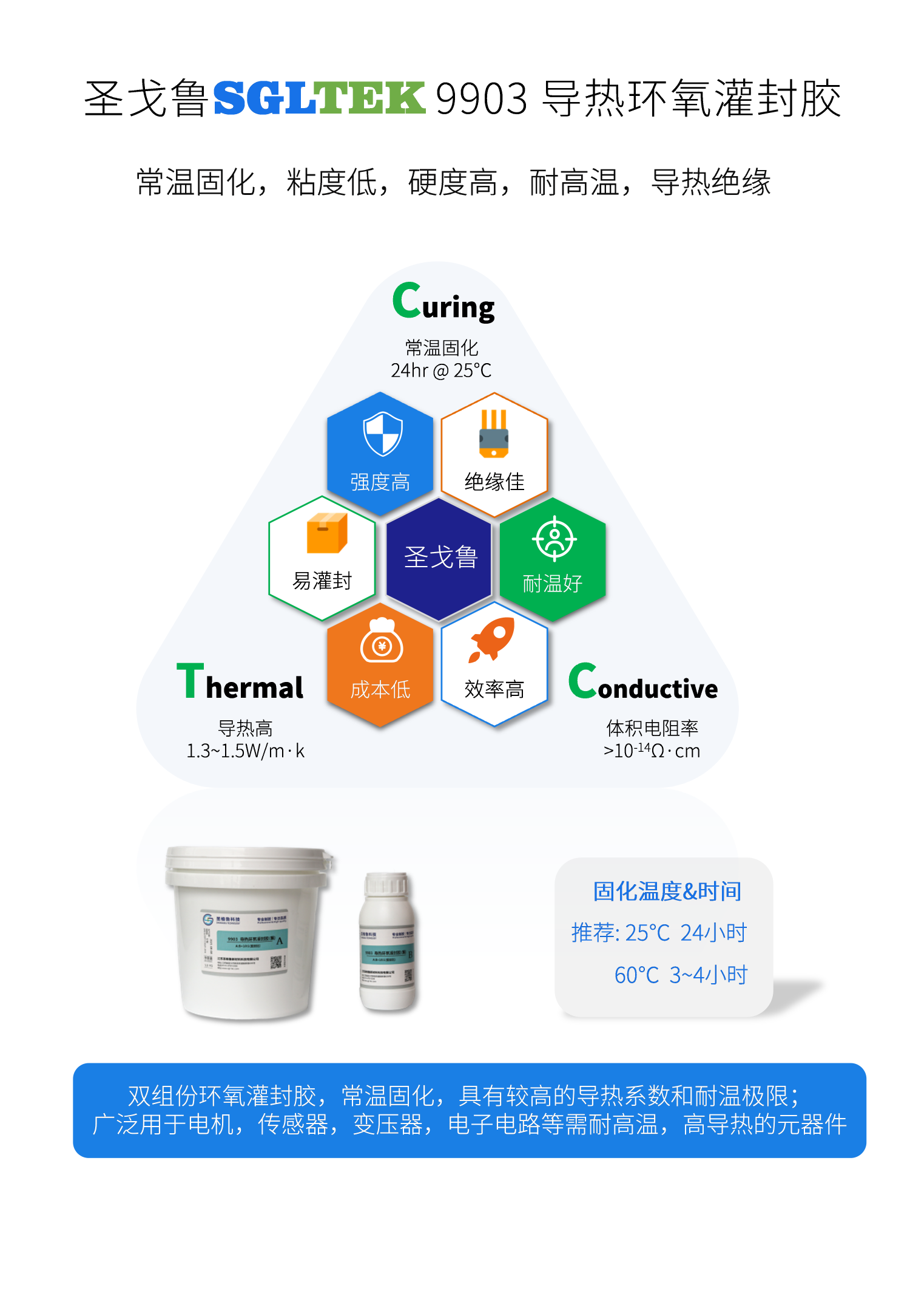 9903 高导热灌封胶具有良好的导热性能,导热系数1.3~1.5w/m·k, 耐温180℃。为电子产品提供了较高保障的散热系数。在连续高温下仍然具有良好的介电性, 电绝缘性能稳定。广泛用于温度传感器,电机,变压器等方面。